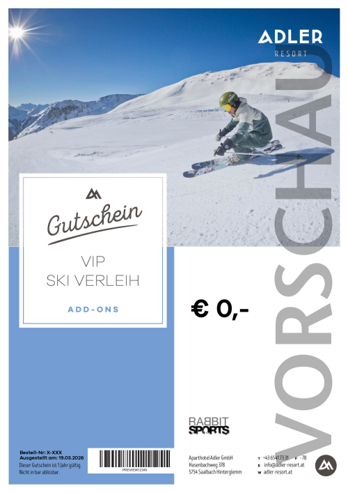 Dieser Ski-VIP-Verleih-Gutschein gibt Ihnen die Möglichkeit, sich Ski oder Snowboard direkt bei Rabbit Sports im ADLER RESORT zu leihen. Noch stressfreier können Sie in den Urlaub starten, wenn Sie Skier oder Snowboard schon online vorbestellen. Dann erhalten Sie diese schon direkt bei Ihrer Ankunft.