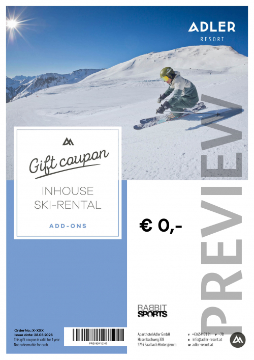 This ski-VIP-rental-voucher gives you the opportunity to rent your skis or snowboard right at Rabbit Sports at the ADLER RESORT. You can start your vacation even more stress-free, if you order the skis or snowboards online before. In this case, you can get them directly upon arrival.